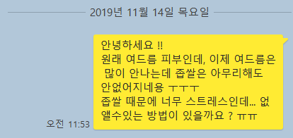 여드름이 올라와 있는 피부를 보면서 늘상 해야하는데하고 생각만 하고 있던 찰나에, 20년 2월 11일날 동성님이 먼저 카톡이 왔더라고요. 오랜만이라면서 걱정되어서 연락했다고 안부인사차 연락을 주셨다고 하면서 제 피부상태는 안녕한지 물어봐주셨습니다. 이때 진짜 해야되는데 다시한번 더 생각을 하게 되었죠.