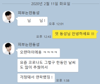 여드름이 올라와 있는 피부를 보면서 늘상 해야하는데하고 생각만 하고 있던 찰나에, 20년 2월 11일날 동성님이 먼저 카톡이 왔더라고요. 오랜만이라면서 걱정되어서 연락했다고 안부인사차 연락을 주셨다고 하면서 제 피부상태는 안녕한지 물어봐주셨습니다. 이때 진짜 해야되는데 다시한번 더 생각을 하게 되었죠.