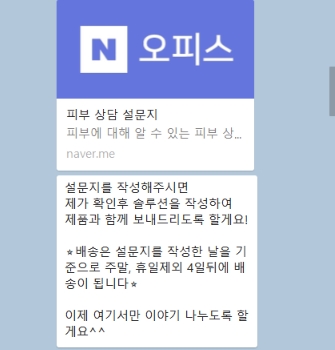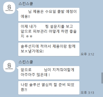 그러고는 카톡방을 옮겨서 피부는민동성이 아니라 이제는 스킨스쿨 카톡방에서 동성님과의 이야기가 시작되었습니다. 제품 출고가 언제 되는지부터 세심하게 말해주셨는데 카톡으로 피부상담 설문지를 전달 받았고 설문지를 작성하고 나니까 피부관련 영상들을 보내주셨어요. 영상을 보면서 제품을 기다렸죠.
