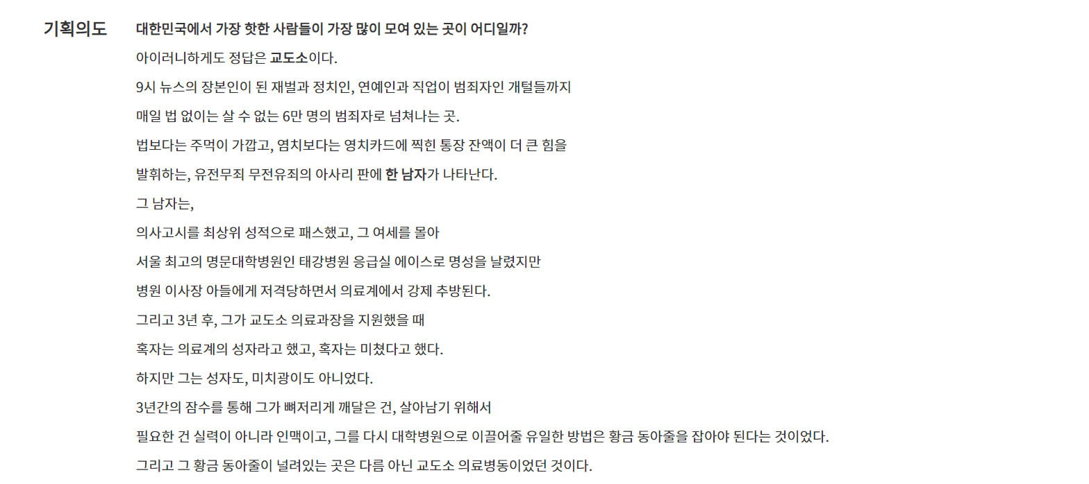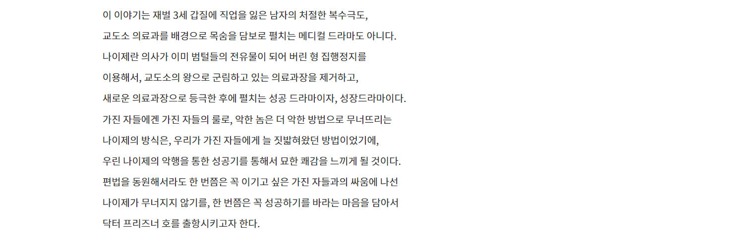 처절한 복수극이나 목숨을 담보로 하는 메디컬 드라마가 아니라 나이제라는 유능한 의사가 황금인맥들이 넘치는 교도소를 편법이라는 형 집행정지로 철저하게 이용해서 가진자들에게 무너뜨리는 통쾌한 복수극이라고 합니다.