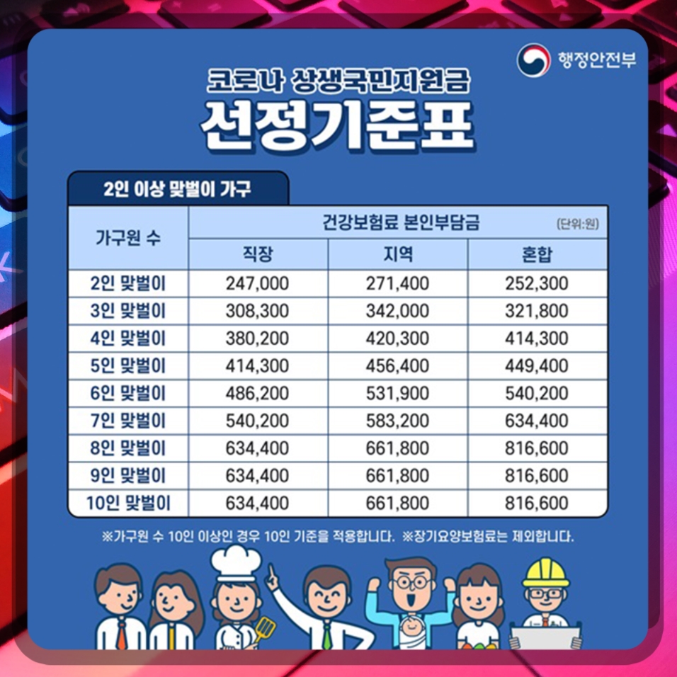 일단 5차 재난지원금인 국민지원금 기본 선정표는 직장보험료 기준으로 1인 11,3600원 / 2인 191,110원 / 3인 247,000원 / 4인 308,330원 입니다.